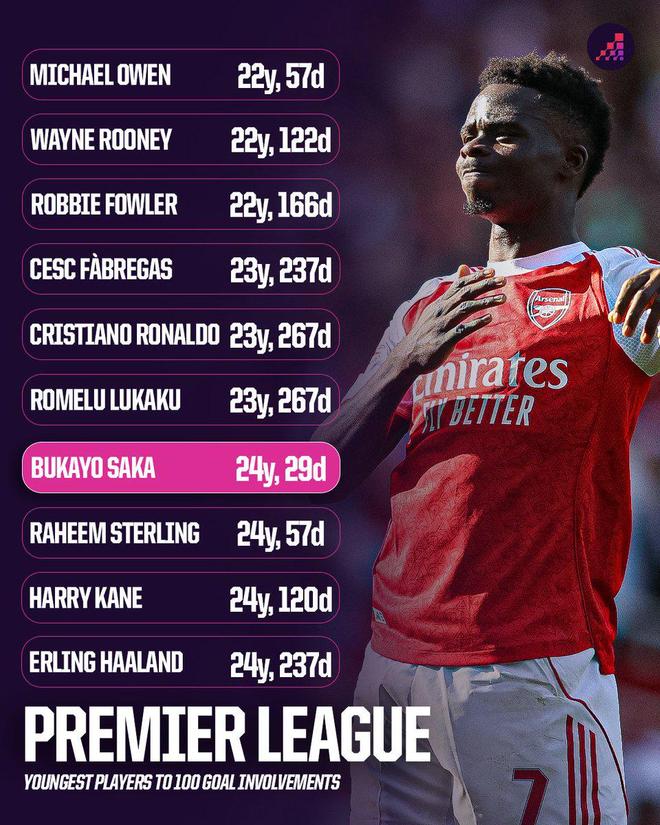 在与西汉姆联队的比赛中,萨卡(Saka)攻入了进球,在英超联赛的职业生涯中达到了100多用的里程碑(55个进球和45个助攻)。根据统计,此外,24岁和29天,是第七名最小的球员,在英超历史上参加了100个进球。 Ranking of the youngest age when players participate in 100 goals in Premier League History 1 Michael Irving 22 years and 57 days 2 Rooney 22 years and 122 days 3 Robbie Fowler 22 years and 166 Days 4 Fabregas 23 years and 237 days 5 Ronaldo 23 years and 267 days 6 lukaku 23 years and 267 days 7 years and 29 days 89 days 8 days 8 days 8 days 8 days 8 days 8 days 8 days 8 days 8 days 8 days 8 days 8 days 8 days 8天8天8天8天8天8天8天8天8天8天8天8天8天8天8天8英镑24年和57天9凯恩24岁和120天10 Haaland 24年237天